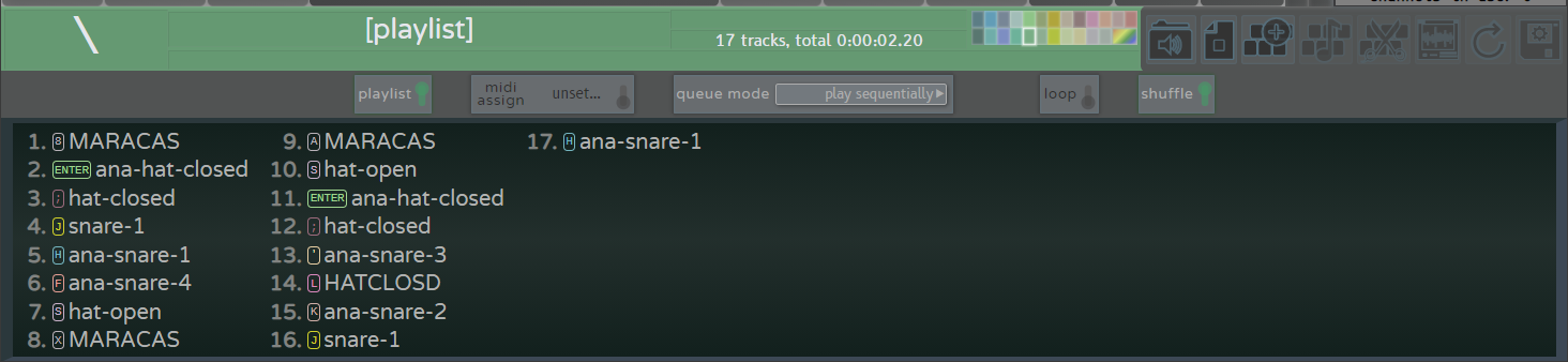Click and drag already-loaded sounds from onscreen keyboard keys in the into the desired position in the playlist, or drop in sound files from an Explorer or Finder window. To reorder the list, click and drag sounds in the playlist to new positions; to remove an item from the list, drag and drop the sound outside of the playlist area. You can load new sound files while in playlist editing mode by dropping files either onto specific keys or onto the playlist itself, or by using the open sound button on the Key Function Toolbar; if using 'open sound' or dropping files directly into the playlist, the selected sound file(s) will be automatically appended to the current playlist and assigned to the first available keyboard key(s) starting from F1. Playlist tracks display with their list position number followed by their source key and then track name. All items in a playlist play according to their individual key configuration settings including keymode and effects settings; there are no playlist-global effects. As you edit the list, the total length of the list is displayed. While in playlist editing mode, you can still press keys to trigger sounds as normal. When a key has a playlist assigned to it, a playlist icon appears in the upper right corner of the onscreen key. ▰ To jump to a playlist sound's key configuration for editing, double click any playlist item. To select all keys whose sounds are in the playlist simultaneously for bulk editing, double click any empty portion of the playlist area (anywhere that does not contain a track).