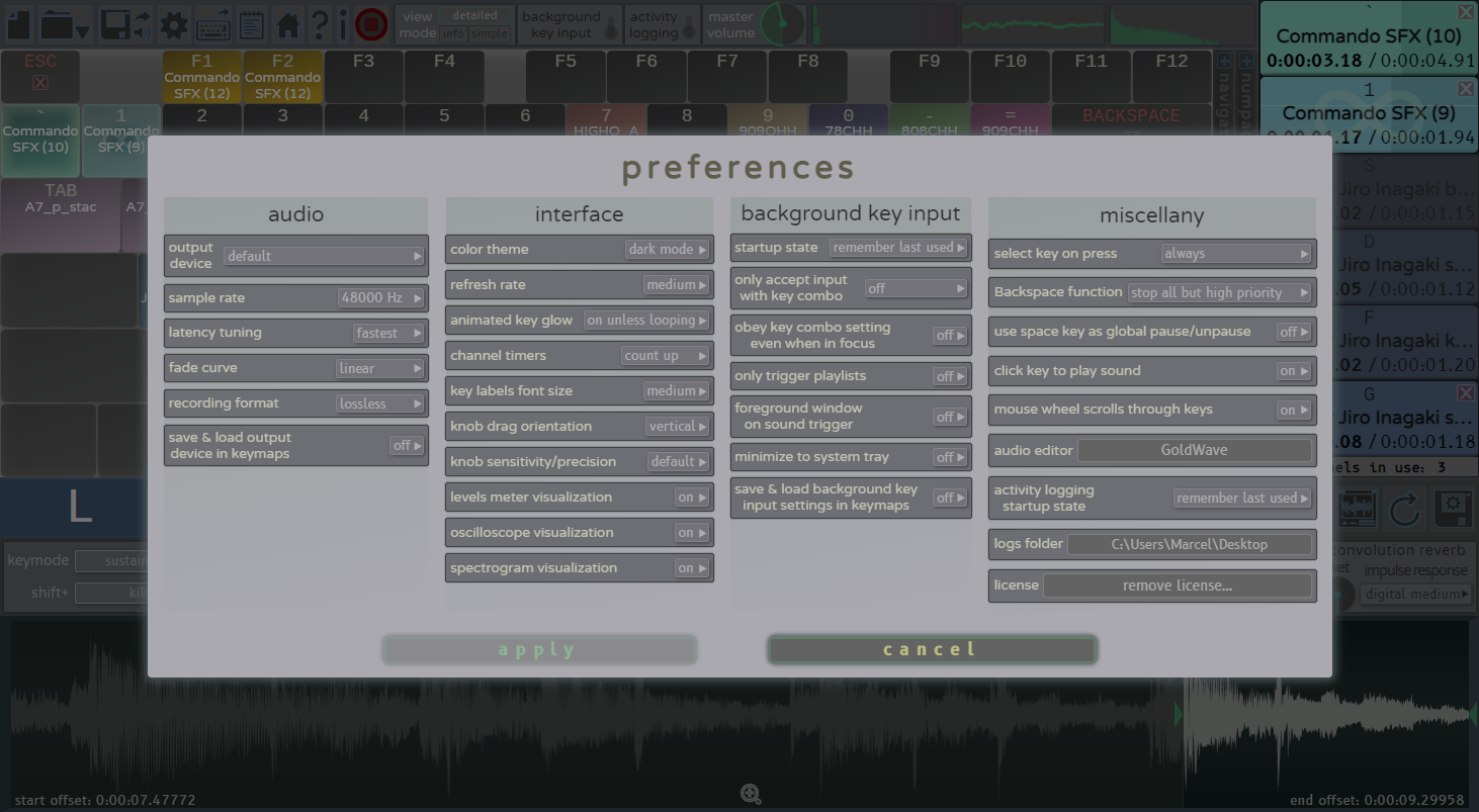 The Escape key is a universal silence key which kills (stops) all currently playing sounds, and the onscreen Escape key can be single clicked to achieve the same function. ▰ The Windows Backspace/Mac Delete key has a similar silence function but can be configured to have a more finely targeted functionality in conjunction with the channel priority and fade settings, and it won't kill sounds that are queued. By default Ctrl+Shift+Backspace (Windows)/Ctrl+Shift+Delete (Mac) performs a fade out all that initiates a fade out in all currently playing sounds using the fade out length set in each key's fade time. This behavior can be changed under Preferences ➔ miscellany ➔ Backspace/Delete function.