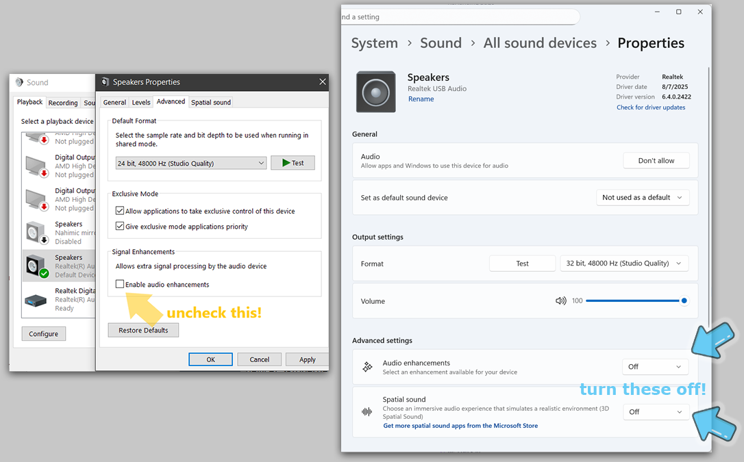 • If you are hearing audio coming out of both channels even with a sound 100% panned to one channel, the most likely culprit is that your computer's audio is set up to use some kind of "audio enhancement" software processing intended to make poor quality speakers sound better or to simulate surround sound. This is an annoying "feature" some computers come preinstalled with and turned on by default, especially on Windows laptops, and it is highly recommended to turn these off as they can negatively affect latency and sound quality. Some possible enhancer names to look out for are "MaxxSense", "SoundMax", or "SmartAudio"; others have a more generic name like "Acoustic Environment Modeling", "Loudness Equalization", "3D Immersion", or "Phantom Speakers". You will have to dig into your system audio settings to disable this, usually found in the Control Panel as its own item, or under Control Panel➔Sound. For example, on one particular Dell laptop the setting was found under Control Panel➔Hardware and Sound➔Dell Audio➔SpeakerHeadphone➔Preset➔MaxxSense. More generic "audio enhancement" settings can often be found in the Sound Control Panel or Windows Settings➔System➔Sound, here's an example pic.