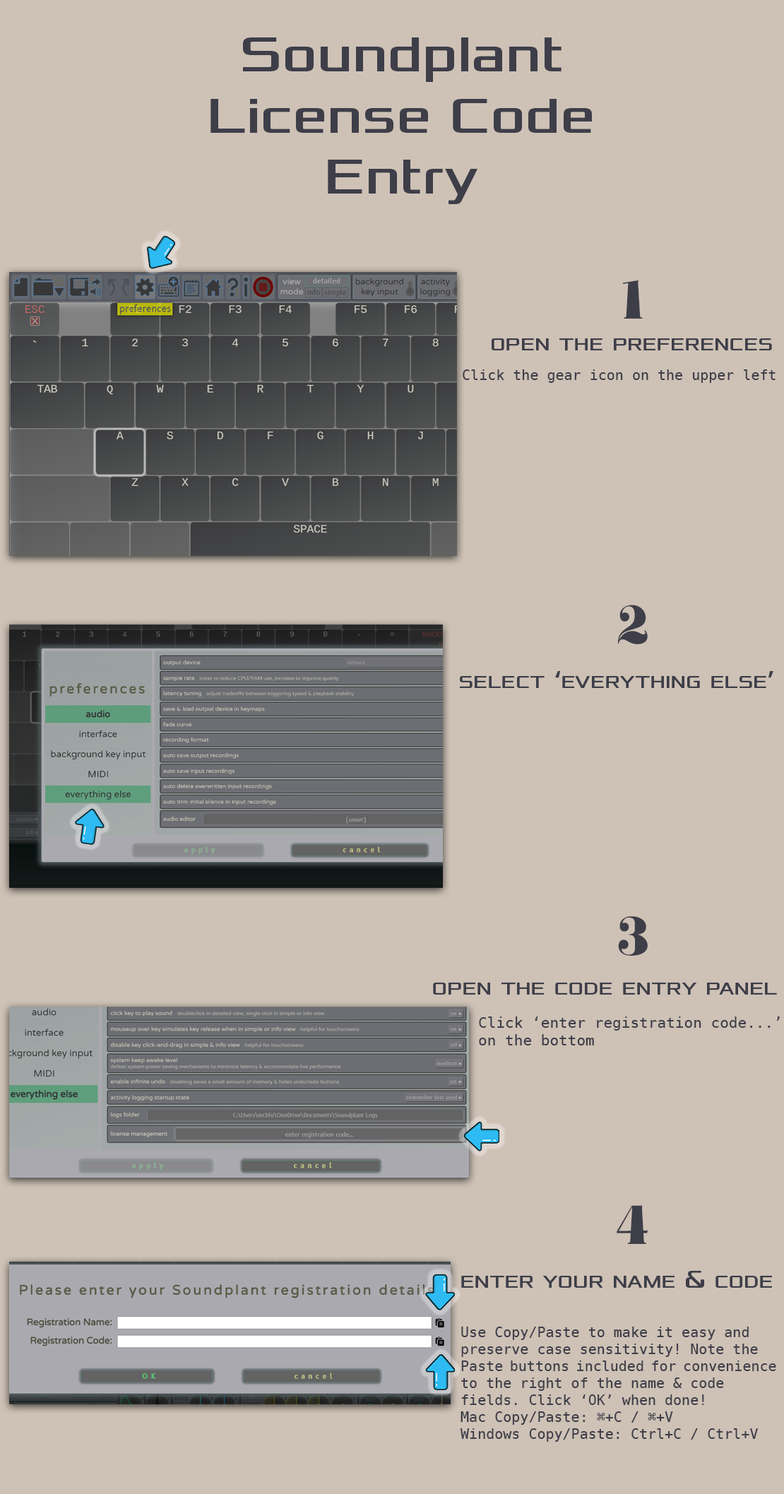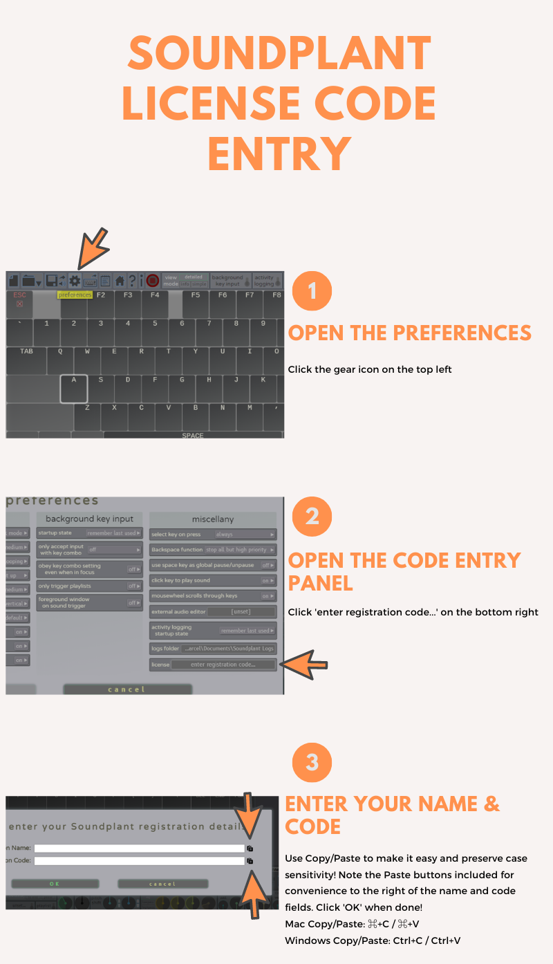 • 99.999% of the time, this is due to you not entering in the code correctly, exactly as it appears in your registration email. Both the registration name and code are case sensitive and should have no trailing or preceding spaces. The easiest and most surefire way to enter them into Soundplant while preserving case is by using copy and paste directly from the email into Soundplant. On Windows copy/paste is Ctrl+c/Ctrl+v, and on Mac it's ⌘+c/⌘+v. If you can't access your email from the machine on which you want to activate a copy of Soundplant, it is recommended that you copy the registration email text onto your Soundplant machine (for example in a .txt file).